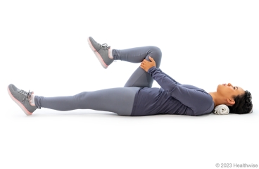 - Clasp your hands together under your bent knee and bring the knee to your chest. Keep the other leg on the floor. You can put a small pillow under your head and neck if it is more comfortable.