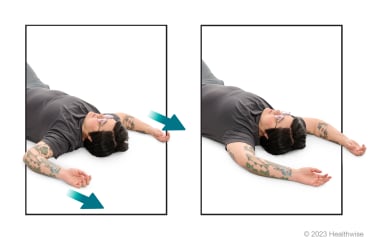 - Lie on your back with your elbows bent. Your arms should be out to your sides, and your arms and elbows should be resting on the surface you are lying on, such as the floor.