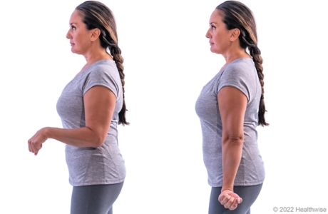 - Hold your affected elbow at your side, bent at about 90 degrees. Make a fist with your palm facing down and bend your wrist down.