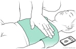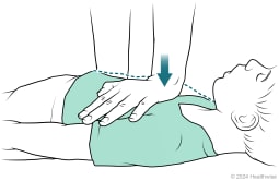 4. Push hard and fast. Give 30 compressions at a rate of about 2 compressions per second. Compress the chest about one-third of the way or about 2 inches. If the child is large, you may need to stack your hands on top of each other.