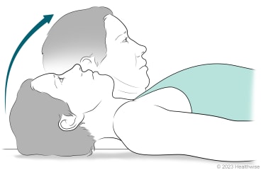 - Bend your head forward so that your chin tucks. Try to see your toes.