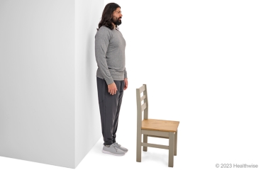 - Stand with a chair in front of you and a wall behind you. If you begin to fall, you may use them for support.