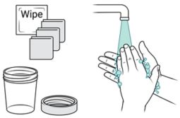 1. Open the wipes. Remove the lid from the container and set it down with the inner surface up. Wash your hands.