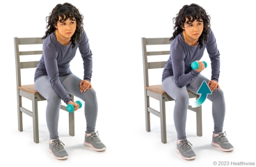 - Slowly lift (curl) the weight up and toward your chest.