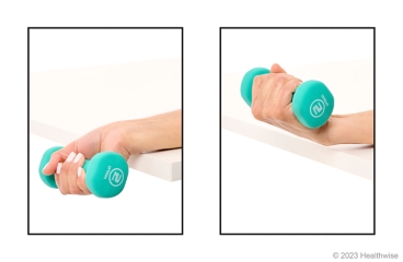 - Place your affected forearm on a table with your hand hanging over the edge of the table, palm up.