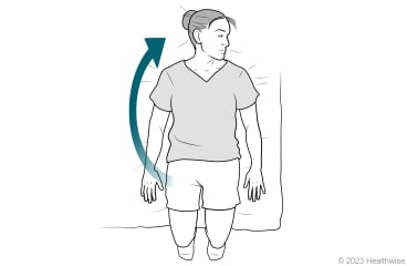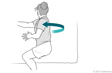 Quickly tilt yourself backward until you are lying on your back with the pillow under your shoulders. Your head will tilt back off the pillow, still at a 45-degree angle. Your head should be about midway between looking straight up and looking out to your side. Hold for at least 20 seconds. Your doctor may tell you to stay in this position until any vertigo stops.