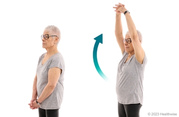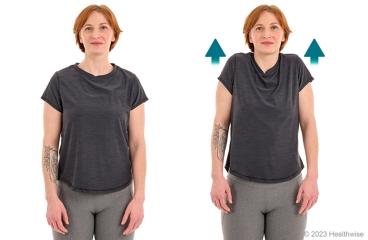 - Raise your arms straight up toward the ceiling. Try not to shrug your shoulders.