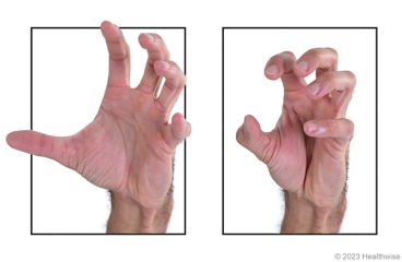 - Slowly straighten the joints of your affected hand where your fingers connect to your hand so that only the top two joints of your fingers are bent. Your fingers will look like a hook.