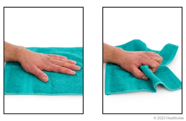 - Put your hand flat on the towel, palm down. Grab the towel, and scrunch it toward you until your hand is in a fist.