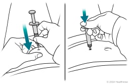 6. Quickly push the needle all the way into the pinched-up fold of skin. Then push the plunger all the way in. Let go of the skin fold.