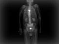 Certain areas of the bone lack the presence of tracer, showing one or more "cold" spots. Cold spots may be caused by a certain type of cancer (such as multiple myeloma) or lack of blood supply to the bone (bone infarction). |