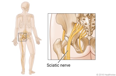 The sciatic nerve is the largest nerve in the body. It is formed by nerve roots coming out of the spinal cord in the lower back. The nerve goes down through the buttock, and then its branches extend down the back of the leg to the ankle and foot.