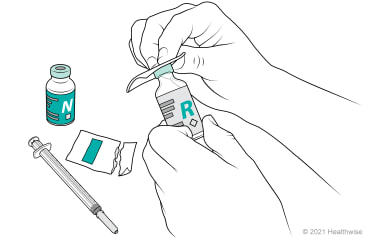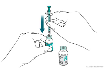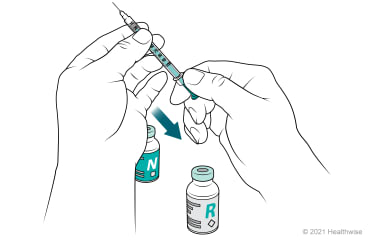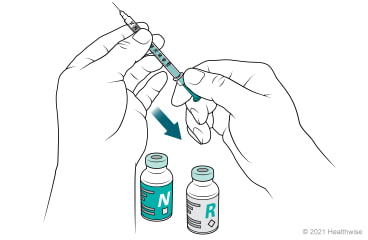 You will mix insulin from two bottles (vials). The order in which you mix the cloudy (long-acting) and clear (short or rapid-acting) insulin is important. Follow the order of the steps below.