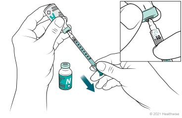 Turn the bottle and syringe upside down. Position the tip of the needle so that it is below the surface of insulin in the bottle.