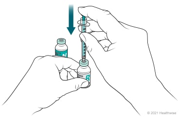 Push the plunger of the syringe to force the air into the bottle. This equalizes the pressure in the bottle when you later remove the dose of insulin.