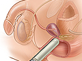 For a transrectal prostate biopsy, an ultrasound probe is inserted into the rectum. Guided by ultrasound, a spring-loaded needle is used to take samples from the prostate through the rectal wall. A transperineal prostate biopsy is less common. This type of biopsy also takes prostate samples, but through a cut made in the perineum, the area between the scrotum and anus.