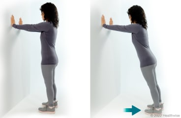 - Place both hands on the wall with your palms flat. Your arms should be straight and at shoulder level.