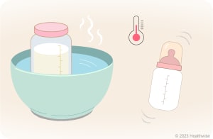 1. Warm the formula or breast milk to room temperature in a bowl of heated water. Shake the bottle. Check the temperature by putting 2 or 3 drops on the inside of your wrist.