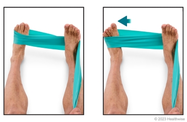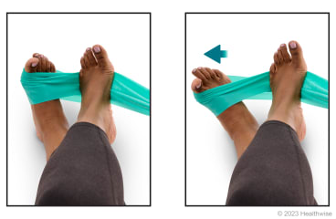 - Hold both ends of an exercise band in one hand and loop the band around the inside of your affected foot. Then press your other foot against the band.