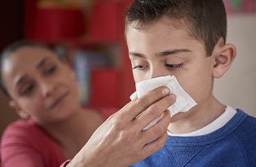 - Have your child sit up and tilt their head slightly forward. This keeps blood from going down the throat.