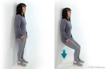 - Slowly squat down as if you are going to sit in a chair, sliding your back down the wall as you squat.