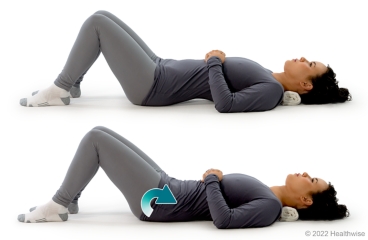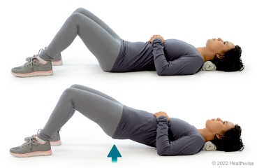 - Tighten your belly muscles by pulling your belly button in toward your spine. Press your lower back to the floor. You should feel your hips and pelvis rock back. Try to keep your belly muscles tight while you do the exercise.