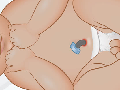 Basic care of your baby's umbilical cord is keeping it clean and dry. To keep the cord dry, give your baby a sponge bath instead of bathing your baby in a tub or sink. Keep your baby's diaper folded below the stump. If that doesn't work well, before you put the diaper on your baby, cut out a small area near the top of the diaper to keep the cord open to air. The stump usually falls off within a couple of weeks.