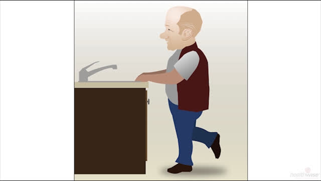 These exercises can help you with balance. You can start by holding on to the sink, the counter, or the back of your chair with both hands. When that gets easy, hold on with just one hand. Then hold on with just two fingers of one hand. Soon you may be able to do each exercise without holding on with either hand. But it's important that you only try this when you feel that the way you are doing it now has become too easy.