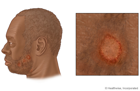 Ringworm of the beard often appears as round or oval patches of bare, scaly skin. Typically, the circular patches spread along their outer borders while clearing at the center, giving a ringed appearance and the name "ringworm." But this pattern is not always seen.