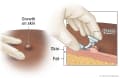 After a local anesthetic is injected, a surgical knife (scalpel) or special razor is used to shave off the growth. Stitches are not needed. Any bleeding can usually be controlled with a chemical that stops bleeding and by applying pressure. The biopsy site is then covered with a bandage or sterile dressing.