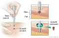 After a local anesthetic is injected, a small, sharp tool that looks like a cookie cutter (punch) is placed over the lesion, pushed down, and slowly rotated to remove a circular piece of skin. The skin sample is lifted up with a tool called a forceps or a needle and is cut from the tissue below. Stitches may not be needed for a small skin sample. If a large skin sample is taken, one or two stitches may be needed. Pressure is applied to the site until the bleeding stops. The wound is then covered with a bandage or sterile dressing.