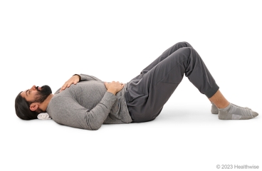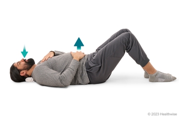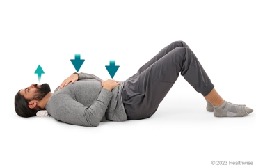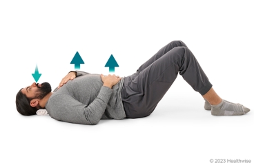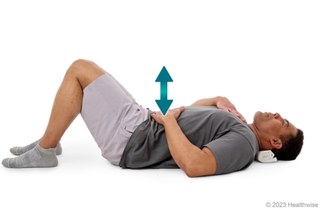For comfort, you can place a small rolled towel under your neck. Or you can prop yourself up on several pillows. Put one hand on your belly and the other hand on your chest.