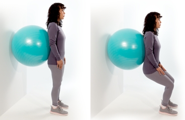 - Slowly squat down as if you are going to sit in a chair, rolling your back over the ball as you squat. The ball should move with you but stay pressed into the wall.