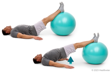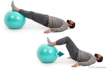 - Lie on your back with your legs up, calves resting on the ball. For more challenge, rest your heels on the ball.