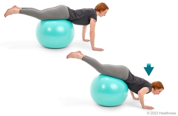 - Holding the plank position, roll as far forward as you can without losing your balance. You may stop with the ball under your thighs, or even under your knees or shins.