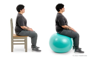 - Sit on an exercise ball, with your feet flat on the floor in front of you and your heels directly under your knees. If you feel unsteady on the ball, practice on a chair first.