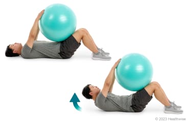 - Slowly tighten your belly muscles. Keep breathing and don't hold your breath. Raising your head and shoulder blades, roll the ball up your thighs. Exhale as you roll up.