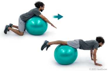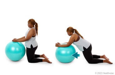 - Press on the ball with your arms and slowly lean forward from your knees. This rolls the ball forward. You will bear most of your weight on your arms. If your back starts to ache, you've gone too far. Pull back a bit.