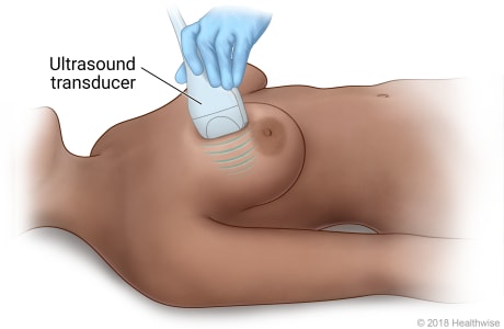 A breast ultrasound is done by moving a small handheld instrument called a transducer back and forth across the skin of the breast. The picture produced by ultrasound is called a sonogram or ultrasound scan.