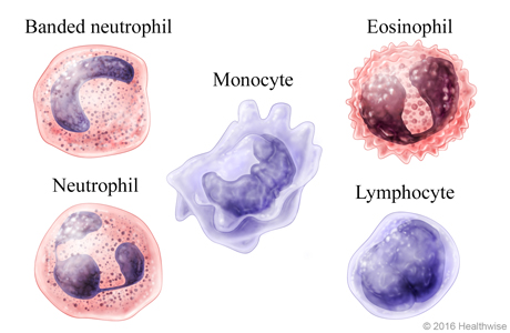 White blood cells protect the body against infection. Types of white blood cells include neutrophils, banded neutrophils, lymphocytes, monocytes, and eosinophils.
