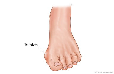 A bunion (hallux valgus) is an enlargement of bone or tissue around the joint at the base of the big toe (metatarsophalangeal joint). This results in a bump on the outside edge of this toe. The skin may be red or irritated, and there may be swelling at the base of the big toe. The big toe may point toward the other toes.