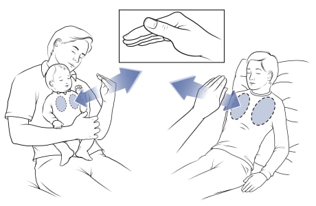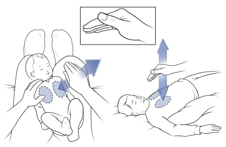 For infants: Lay your child on their back, on your lap. Keep your child's head and upper body flat. Hold your child steady with one hand. With the other hand, gently clap on the front of the chest and just below the nipple. Clap for 1 to 3 minutes. Repeat on the other side of the chest.