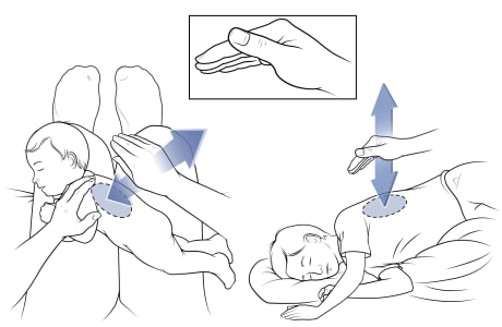 For infants: Lean back slightly (about 30 degrees) while resting your child's back on your chest. Hold your child around the waist with one arm to keep them steady. With the other arm, gently clap between the collarbone and nipple. Clap for 1 to 3 minutes. Repeat on the other side of the chest.