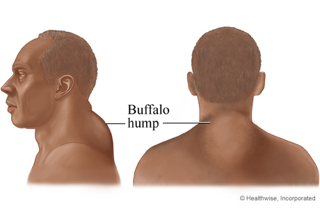 A buffalo hump is a bulge of extra fat around the neck and upper part of the back. It is a symptom of Cushing's syndrome.