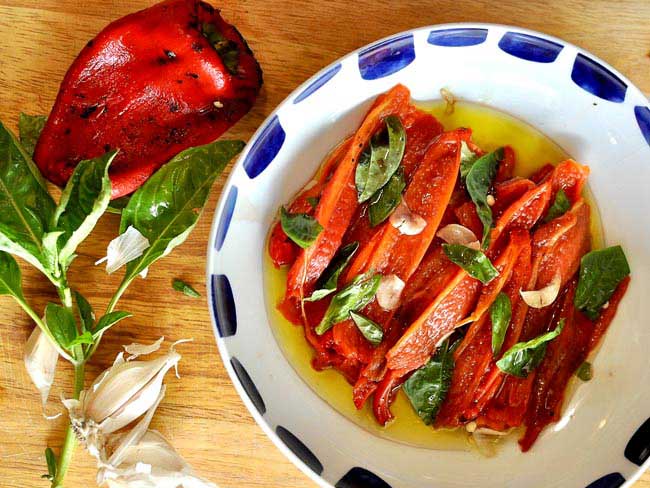 - Tear peppers into strips and place in bowl. Cover with extra virgin olive oil, balsamic vinegar, and a pinch of salt. Garnish with torn basil leaves and shaved garlic.